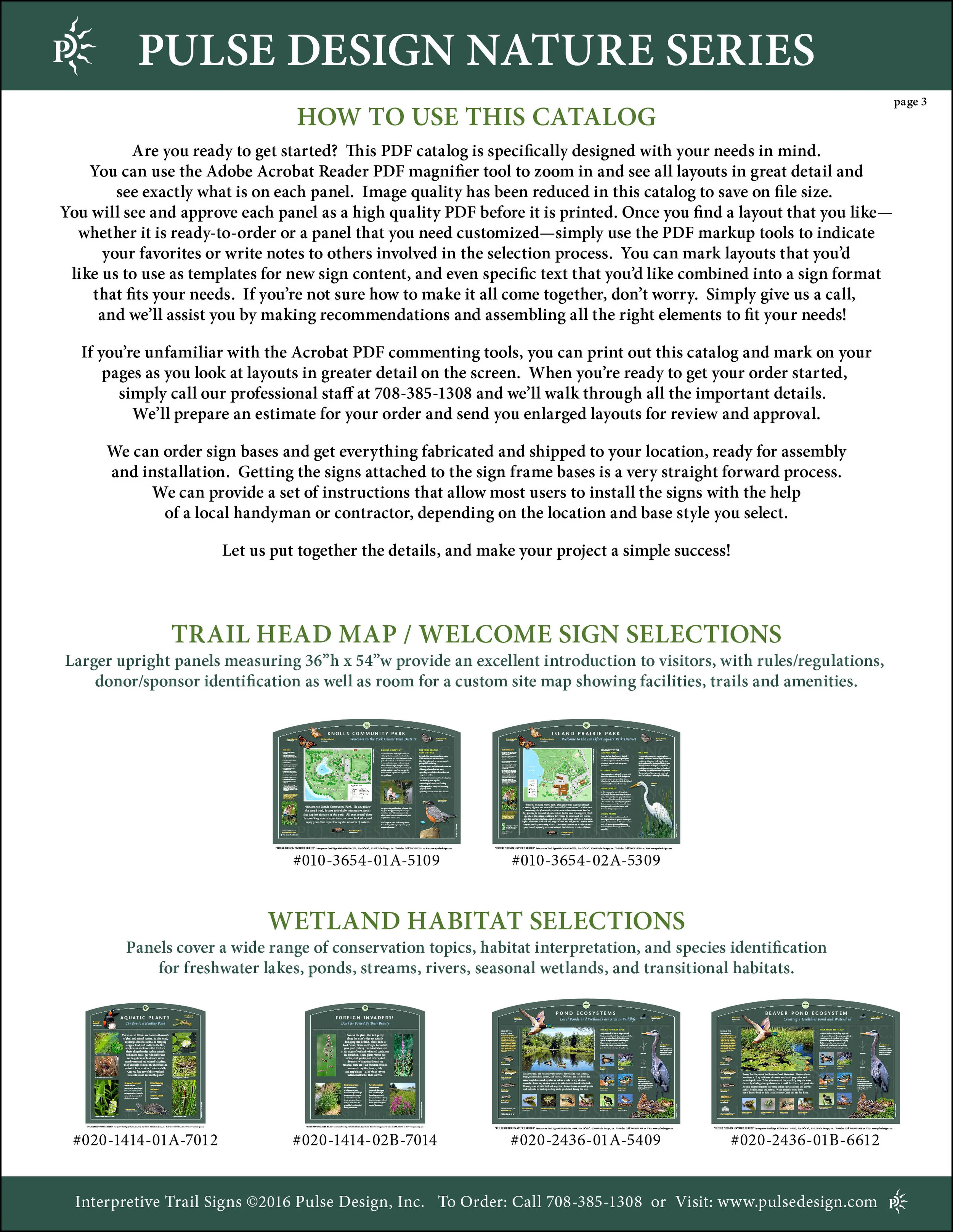 We are proud to offer the PULSE DESIGN NATURE SERIES which is a beautiful, "Ready-to-Order" and "Customizable" series of interpretive trail signs that cover many common nature subjects. This product is perfect for projects with a modest budget and short deadlines. With over 300 signs to choose from, and a 10 year manufacturers warranty, we are sure to have something that will suit your needs. If we don't have it, we can make it special for you! These signs feature colorful, high quality photographic imagery that our customers fall in love with. You can view all of our signs here on the website and also a smaller selection in our 2016 PDF Catalog.